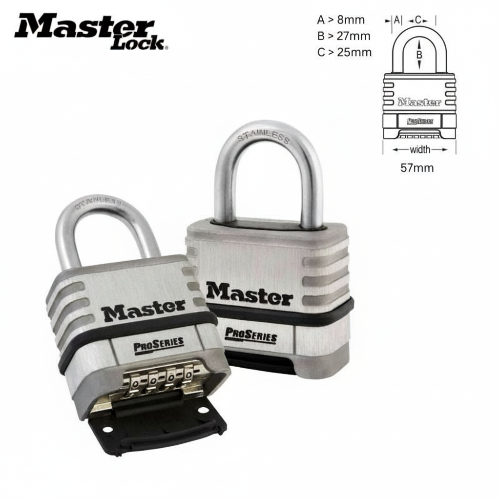 The Master Lock No. 1174D ProSeries® Resettable Combination Padlock is designed for commercial/industrial applications and features a 58mm wide stainless steel body and a 28mm tall, 8mm diameter stainless steel shackle for extreme corrosion resistance. A set-your-own combination feature offers convenience and security with 10,000 possible combinations – no reset tool required – and a deadlocking mechanism protects against prying, shimming and rap attacks.