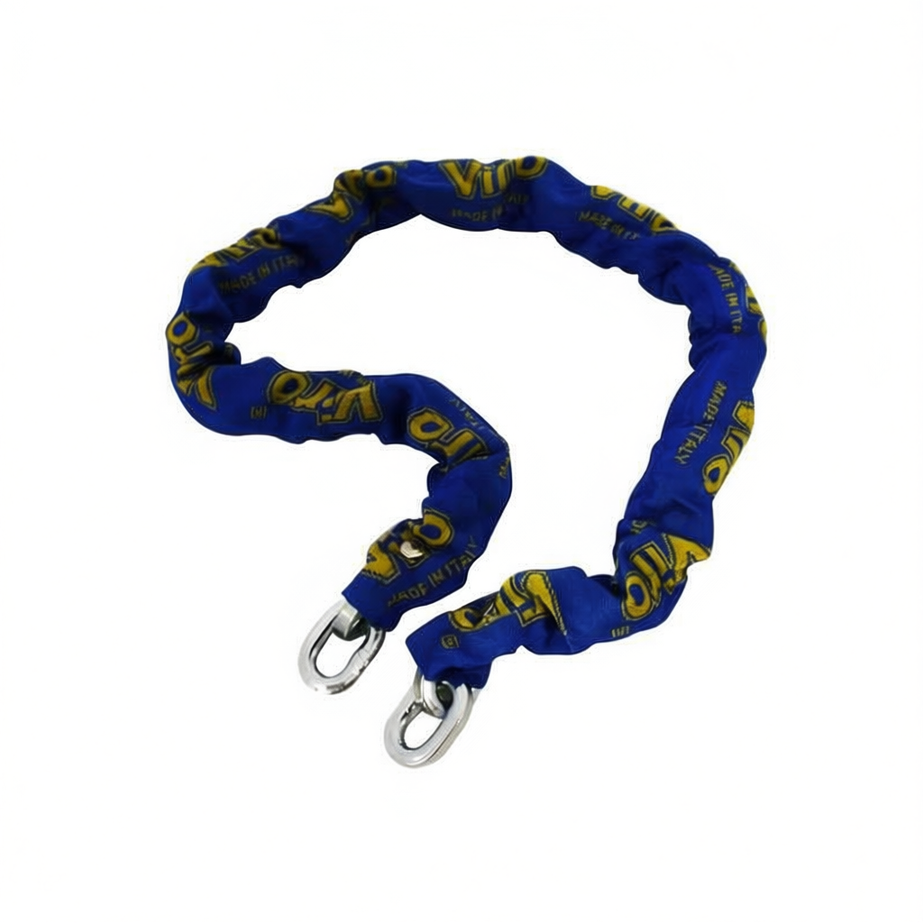 Case hardened manganese steel chain, galvanised with a blue fabric scratch-proof sleeve. Made in Italy.